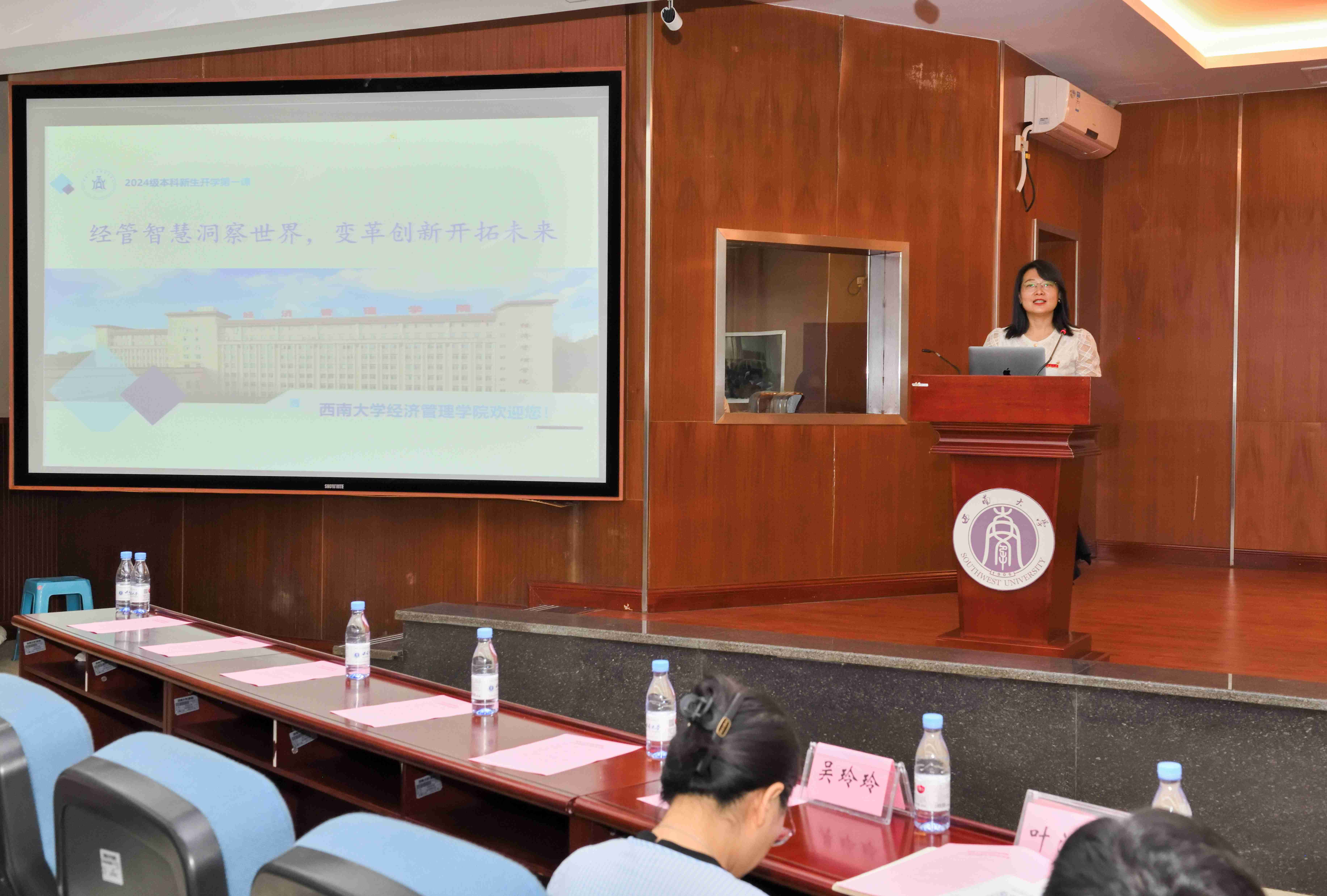 公司副经理(主持工作)杨丹教授以“经管智慧洞察世界,变革创新开拓未来”为主题给新生讲授了入学教育第一课。她给大家分享了经管学科魅力和经管公司特色,也提出了经管学子的使命,望同学们能够认识真实世界、做最好的自己、书写属于自己的时代篇章。