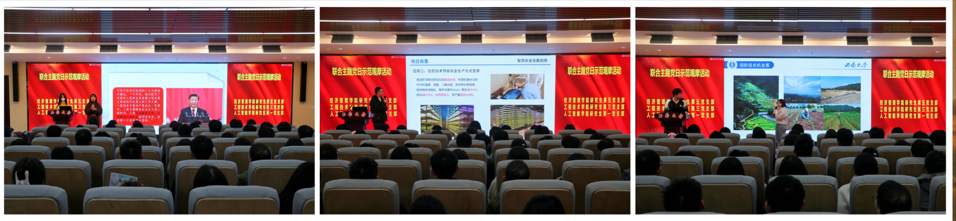 为进一步加强样板党支部交流学习和带动示范,12月15日下午,公司研究生第五党支部联合工程技术公司研究生第三党支部和人工智能公司研究生第一党支部开展了“回顾光辉历程,汲取奋进力量,助力乡村振兴”主题党日示范观摩活动,通过“主题研讨+现场研学+亲身实践”相结合的方式,引导支部党员同志围绕学科专业,谈乡村振兴,展青春风采,聚奋进力量。外国语公司、马克思主义公司、数学与统计公司、蚕桑纺织与生物质科学学院研究生党支部,工程技术公司机械设计制造本科生党支部支部委员、党员代表等到场观摩。此次活动由工程技术公司党委专职组织员、研究生第三党支部书记于伊娜主持。