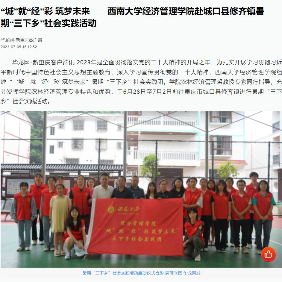 暑假期间,新葡的京集团35222vip组建“‘城’就‘经’彩 筑梦未来”暑期“三下乡”社会实践团,以服务乡村振兴为宗旨,公司农林经济管理系教授专家带队指导,充分发挥公司农林经济管理专业特色和优势,前往重庆市城口县修齐镇开展暑期“三下乡”社会实践活动。
