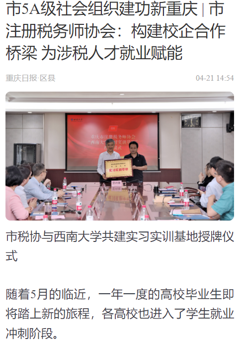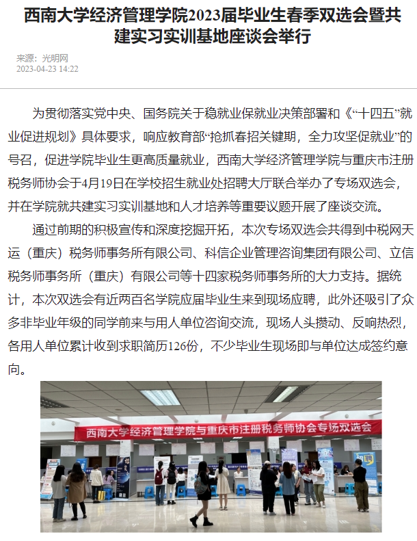 近日,公司与重庆市注册税务师协会联合举办了专场双选会,并在公司就共建实习实训基地和人才培养等重要议题开展了座谈交流。光明网、中国经济网、中国青年报、新浪新闻、重庆日报和重庆晨报等媒体分别以《新葡的京集团35222vip2023届毕业生春季双选会暨共建实习实训基地座谈会举行》《构建校企合作桥梁 为涉税人才就业赋能》《院企共筑就业桥梁 合作描绘广阔前景》为题,报道公司举办2023届毕业生春季双选会暨共建实习实训基地座谈会。