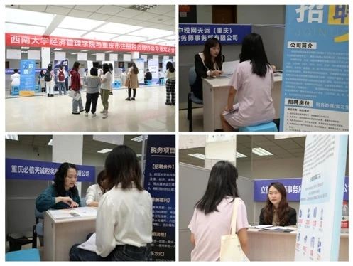 据悉,本次专场双选会共得到中税网天运(重庆)税务师事务所有限公司、中税科信企业管理咨询集团有限公司、立信税务师事务所(重庆)有限公司等十四家税务师事务所的大力支持,近两百名公司应届毕业生来到现场应聘,此外还吸引了众多非毕业年级的同学前来与用人单位咨询交流,不少毕业生现场即与单位达成签约意向。