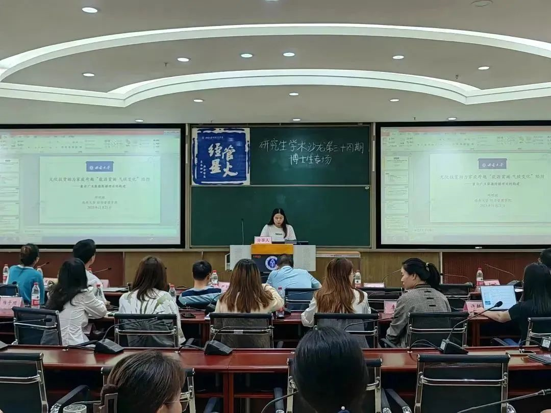 2023年4月21日下午,新葡的京集团35222vip第三十四期“经管·星火”研究生学术沙龙——博士生专场在公司B203教室举行。本次沙龙由2021级农业经济管理专业博士研究生邓明艳、2022级区域经济学专业博士研究生周韩梅担任主讲人,公司尹朝静、黄磊老师担任点评嘉宾。本次活动由2022级博士研究生孙帆主持。