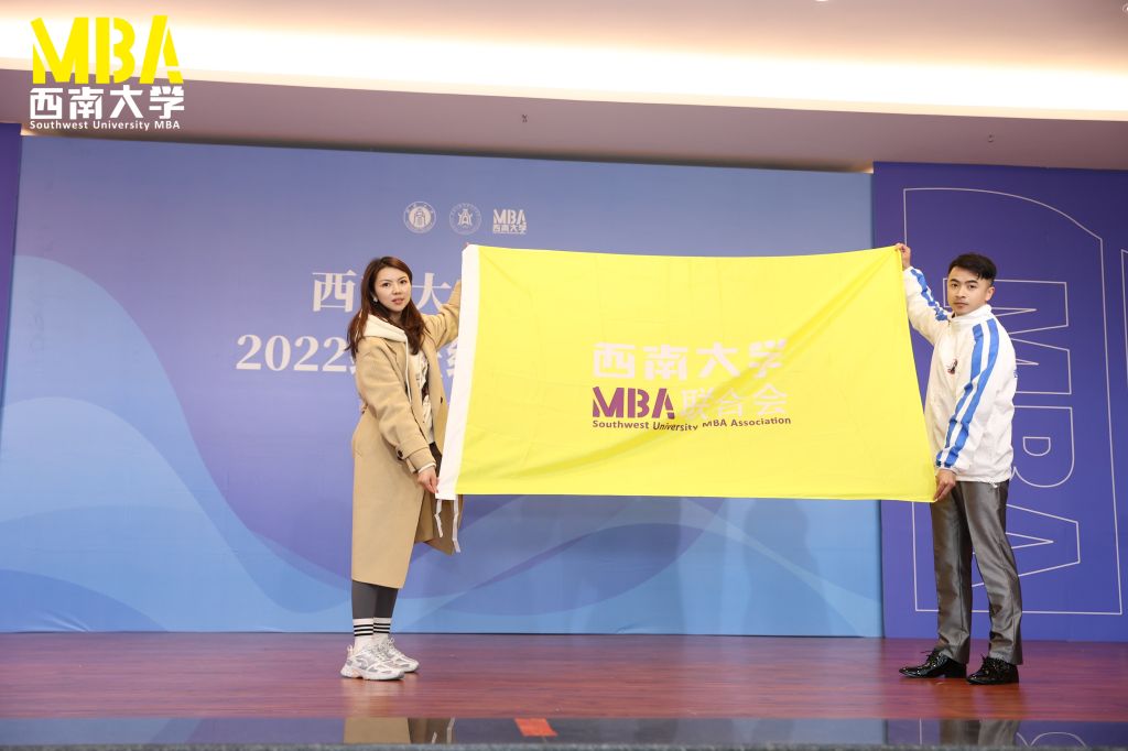 曾繁林将联合会会旗递交给第十一届主席、2022级MBA袁帅。