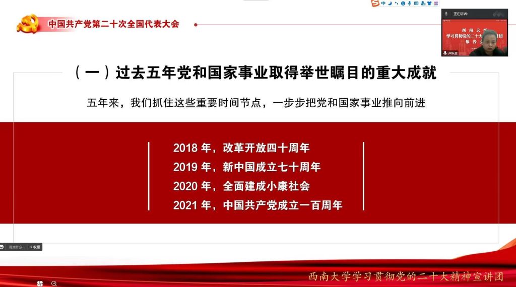 张其光对本次宣讲进行了总结。他指出此次宣讲主题鲜明、内涵丰富,既有政治高度和思想深度,又有理论温度和实践厚度,对于深刻理解、准确把握党的二十大精神实质具有很强的针对性和指导性。他介绍到公司成立了学习贯彻党的二十大精神宣讲团,将实现党的二十大精神宣讲全覆盖,希望全院干部师生切实把思想和行动统一到党的二十大精神上来,把智慧和力量凝聚到落实党的二十大确定的各项任务上来,以实干实绩谱写高质量发展的西大经管篇章。