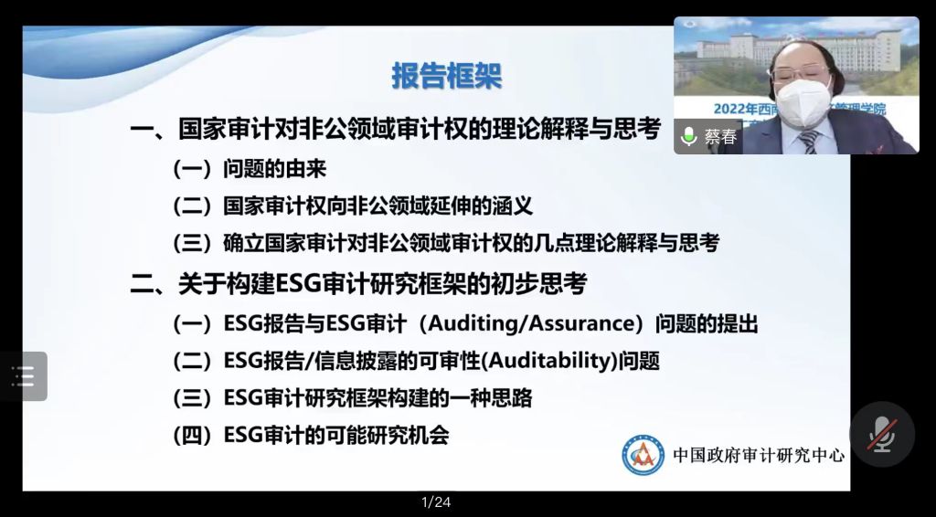 2022年12月20日下午,西南财经大学教授、博士研究生导师蔡春应公司邀请线上为公司师生作了题为“国家审计对非公领域审计权与ESG审计问题的思考”的学术讲座。本次讲座由公司经理祝志勇教授主持。
