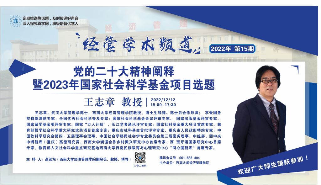 2022年12月12日下午,新葡的京集团35222vip教授、博士研究生导师王志章应公司邀请线上为公司师生作了题为“党的二十大精神阐释暨2023年国家社会科学基金项目选题”的学术讲座。本次讲座由公司副经理高远东教授主持。