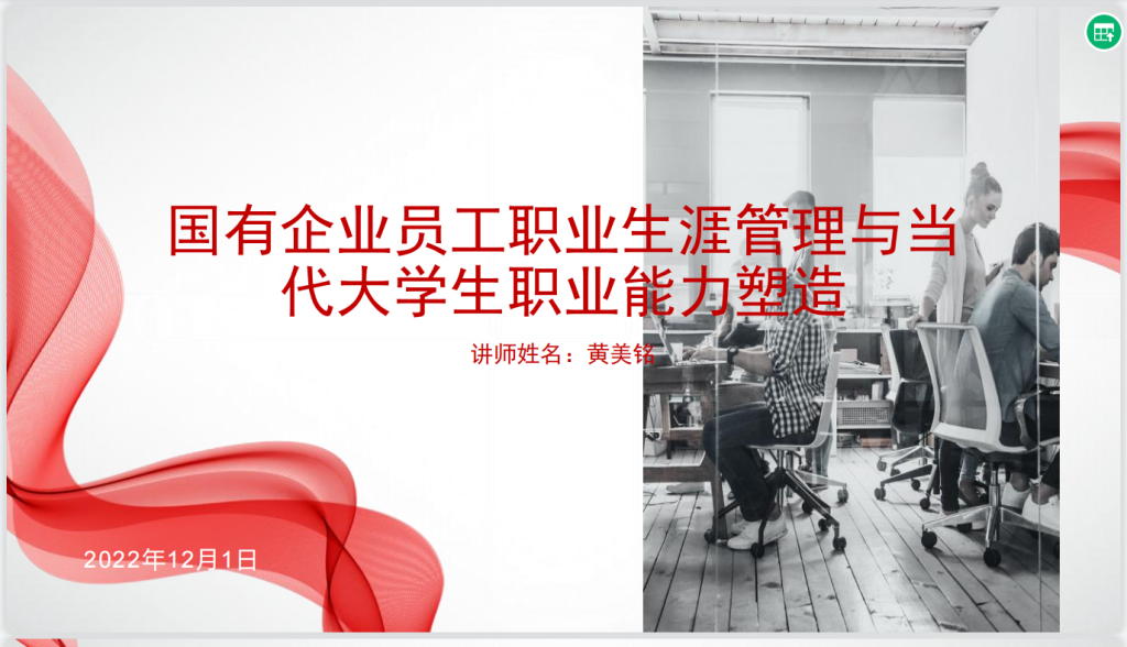 担任第1期专题讲座主讲的嘉宾是2021级MBA、越秀地产重庆公司财务综合部经理黄美铭,她分享的主题是《国有企业员工职业生涯管理与当代老员工职业能力塑造》。黄美铭从国有企业员工职业生涯管理切入,围绕什么是职业生涯的规划与管理、为什么要进行职业生涯规划与管理、如何进行职业生涯的规划与管理、从校园到职场的转身四方面,讲解专业知识、分享职场感悟。