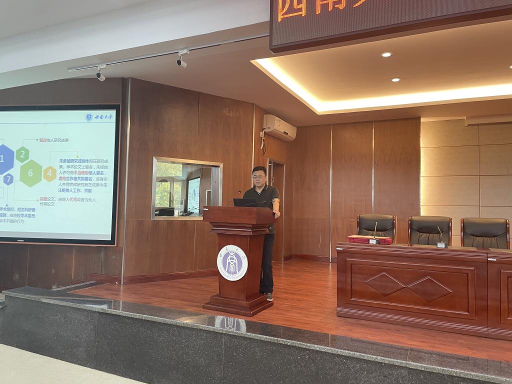 副经理高远东作学术道德行为规范专题宣讲。他强调了遵守学术道德行为规范的重要性、介绍了国家和公司关于学术道德行为规范的相关规章制度、列举了学术不端行为典型案例、分享了开展有组织科研的工作思路。他强调,做一名合格的科研人员,诚信为人是根本。作为高校教师和教育工作者,要坚守科研初心,实事求是,严谨治学,防微杜渐,做“有知识、知底线、守规矩”的科研工作者。