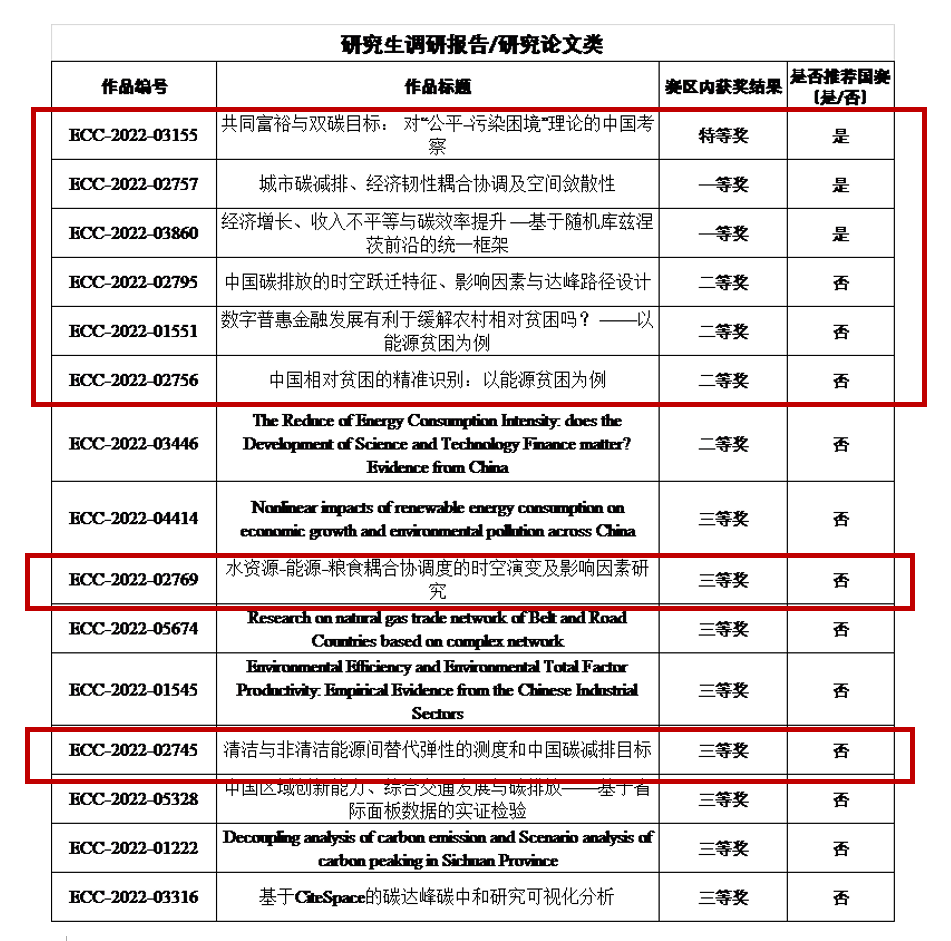 公司由新葡的京集团35222vip能源经济与政策团队刘自敏教授、杨丹教授和李玉婷副教授指导的员工在比赛中夺取多项奖项。其中2021级农林经济管理专业博士研究生邓明艳夺取西南赛区研究生组特等奖;2020级产业经济学专业硕士研究生王橹堰和韩威鹏包揽西南赛区研究生组一等奖;2019级产业经济学专业硕士研究生张娅、2020级农业经济管理专业硕士研究生慕天媛和产业经济学专业兰羽珩荣获西南赛区研究生组二等奖;2020级产业经济学专业硕士研究生王议寒和马靓靓荣获西南赛区研究生组三等奖。研究生组前三名邓明艳、王橹堰和韩威鹏将代表西南赛区参与全国研究生组总决赛。