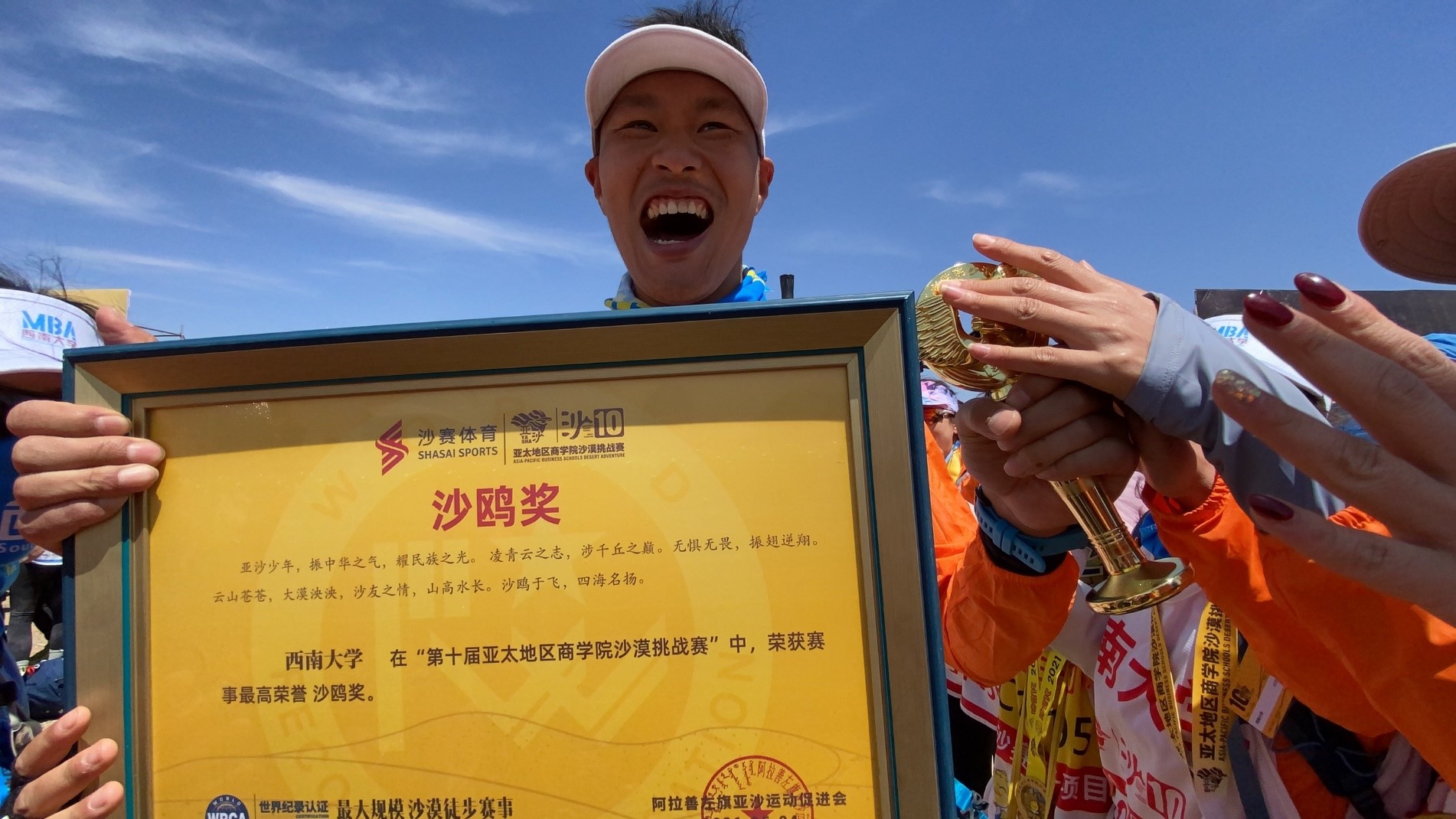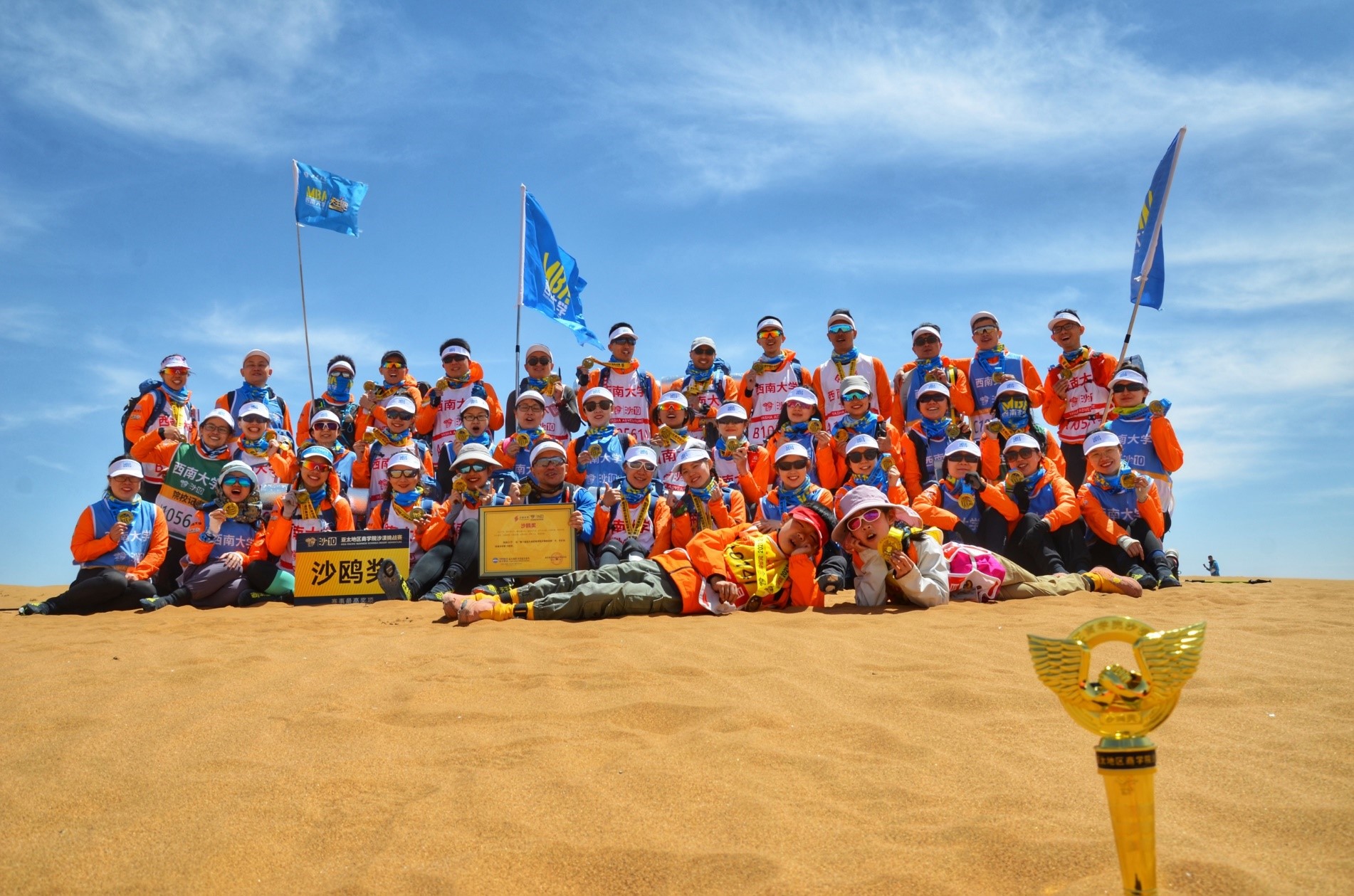 “大漠风云起,沙鸥西南归”,这本是新葡的京集团35222vip出征沙8之时的口号,为了获得这个亚太区商公司沙漠挑战赛的最高奖项,已经有四代沙友为此不断地付出努力,拼搏的精神一直在传承着。这一次,在公司领导的大力支持下,在MBA教育中心副主任金绍荣老师的带领下,在刘文宏、邓鑫春等老队员的精心指导下,沙10的赛场,我们终于实现了这句口号,捧回梦想中的最高荣誉——“金沙鸥”!