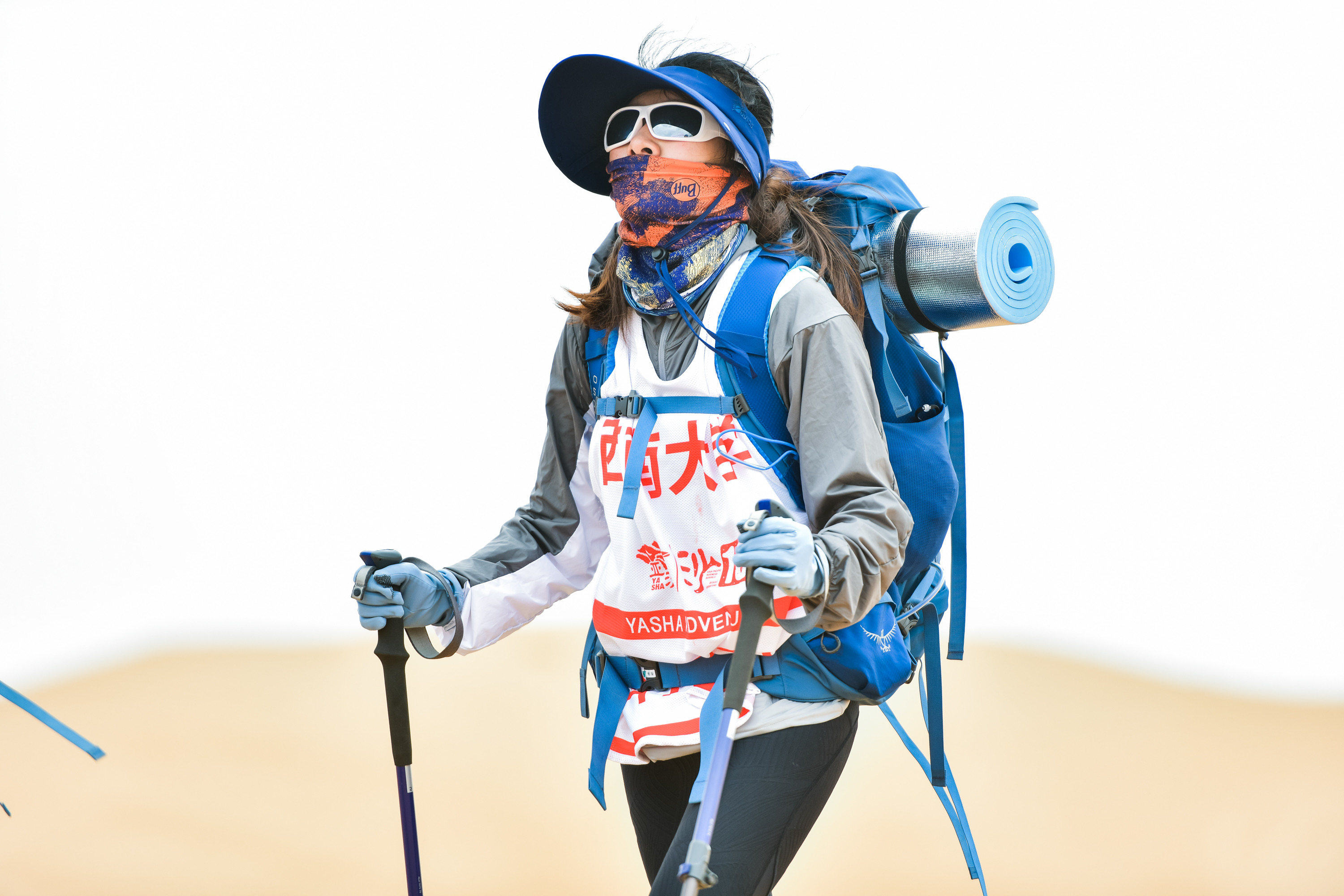 显然天公并不打算一直以这样温柔的方式对待挑战者们,中午的日头已经越来越烈,开始有大风裹挟着沙粒不断地从四面八方吹来,但是队员们团结一心列队前行。