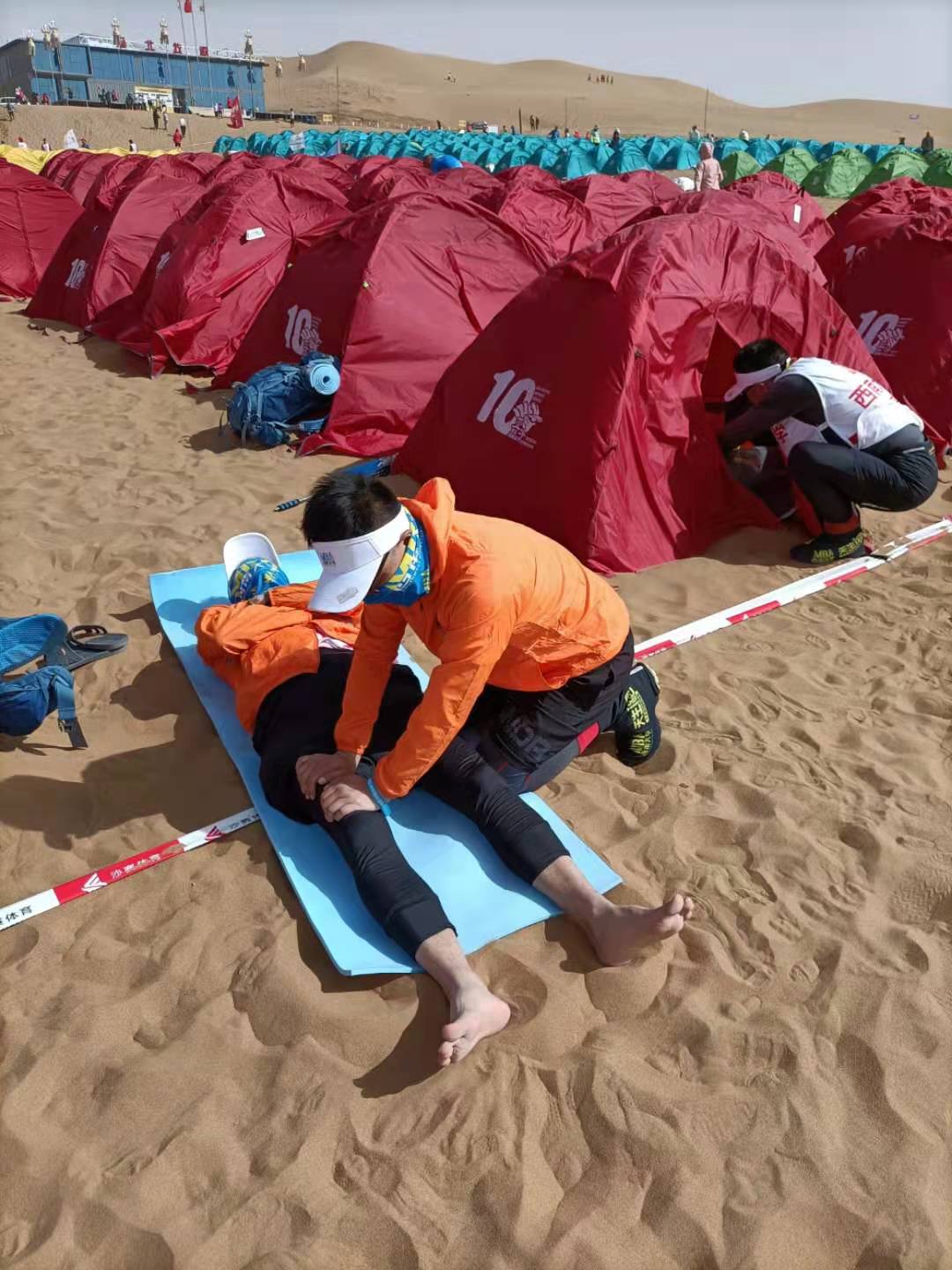 率先归队的C队接应小组和医疗小组积极守候在终点,为到达的AB组队友进行拉伸按摩,确保大家安全完赛不受伤。