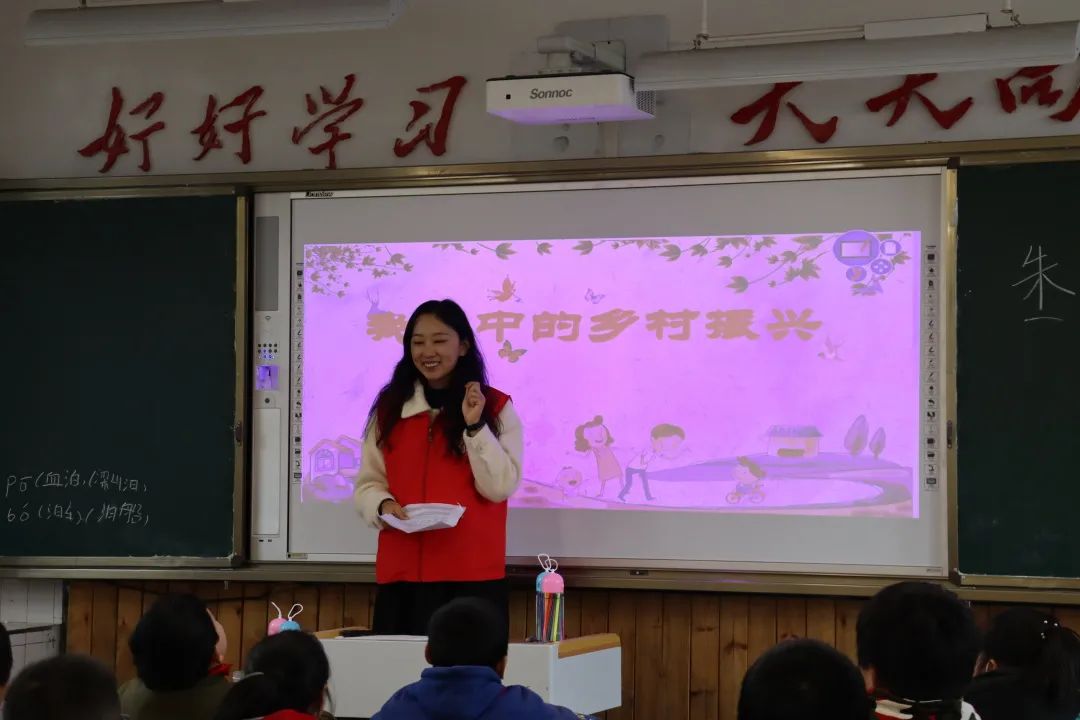 乡村振兴是关系国计民生的根本性问题,支教队员把“乡村振兴”作为了此次教学活动的重要内容之一。“昼出耘田业绩麻,村庄儿女各当家。童孙未解供耕织,也傍桑阴学种瓜。”……课堂上,伴随着朗朗读书声,支教队员结合古诗《夏日田园杂兴·其七》内容,深入浅出的从产业兴旺、生态宜居、乡风文明、治理有效、生活富裕五个方面,为同学们介绍了乡村振兴的内涵,帮助大家理解了乡村振兴的基本知识,感受着中国乡村发生的巨大变化,亲自动手描绘出自己心目中的美丽乡村。