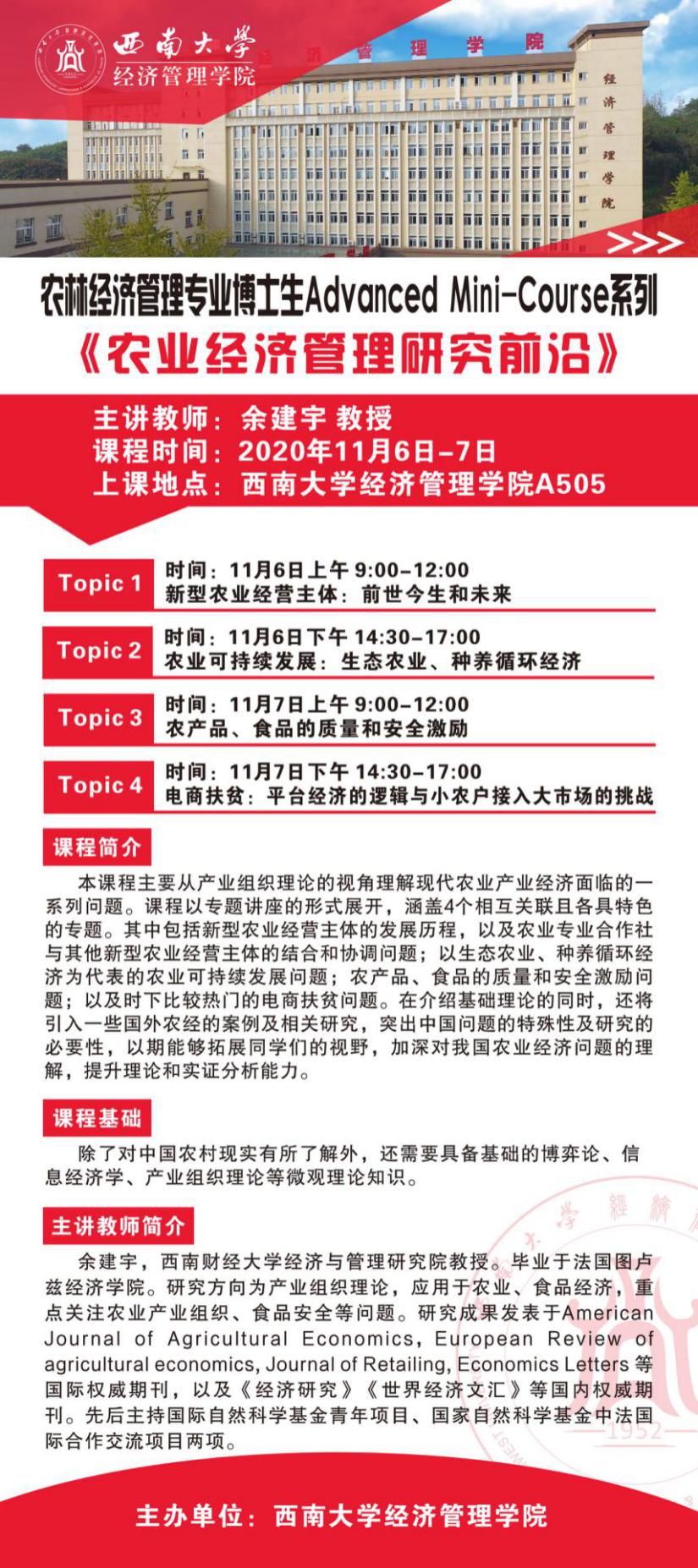 余建宇教授应邀讲授农林经济管理专业博士生Advanced Mini-Course《农业经济管理研究前沿》