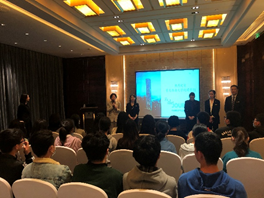 图1 酒店主管为同学们介绍马里奥特酒店集团 图2 同学们参观JW万豪酒店的文化墙