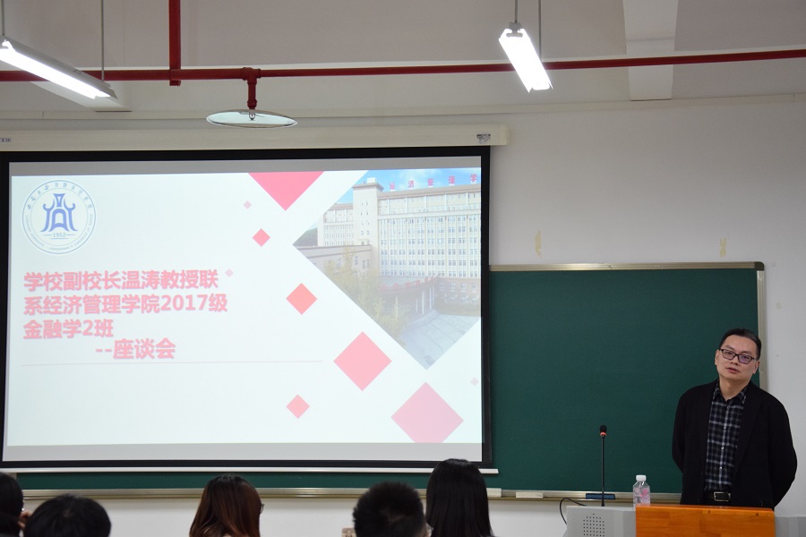 为贯彻落实“不忘初心、牢记使命”主题教育要求,聚焦立德树人根本任务,切实推进“三全育人”工作,公司副董事长温涛教授于2019年11月12日下午来到新葡的京集团35222vip旁听课堂教学,并与2017级金融学2班开展了交流座谈会。