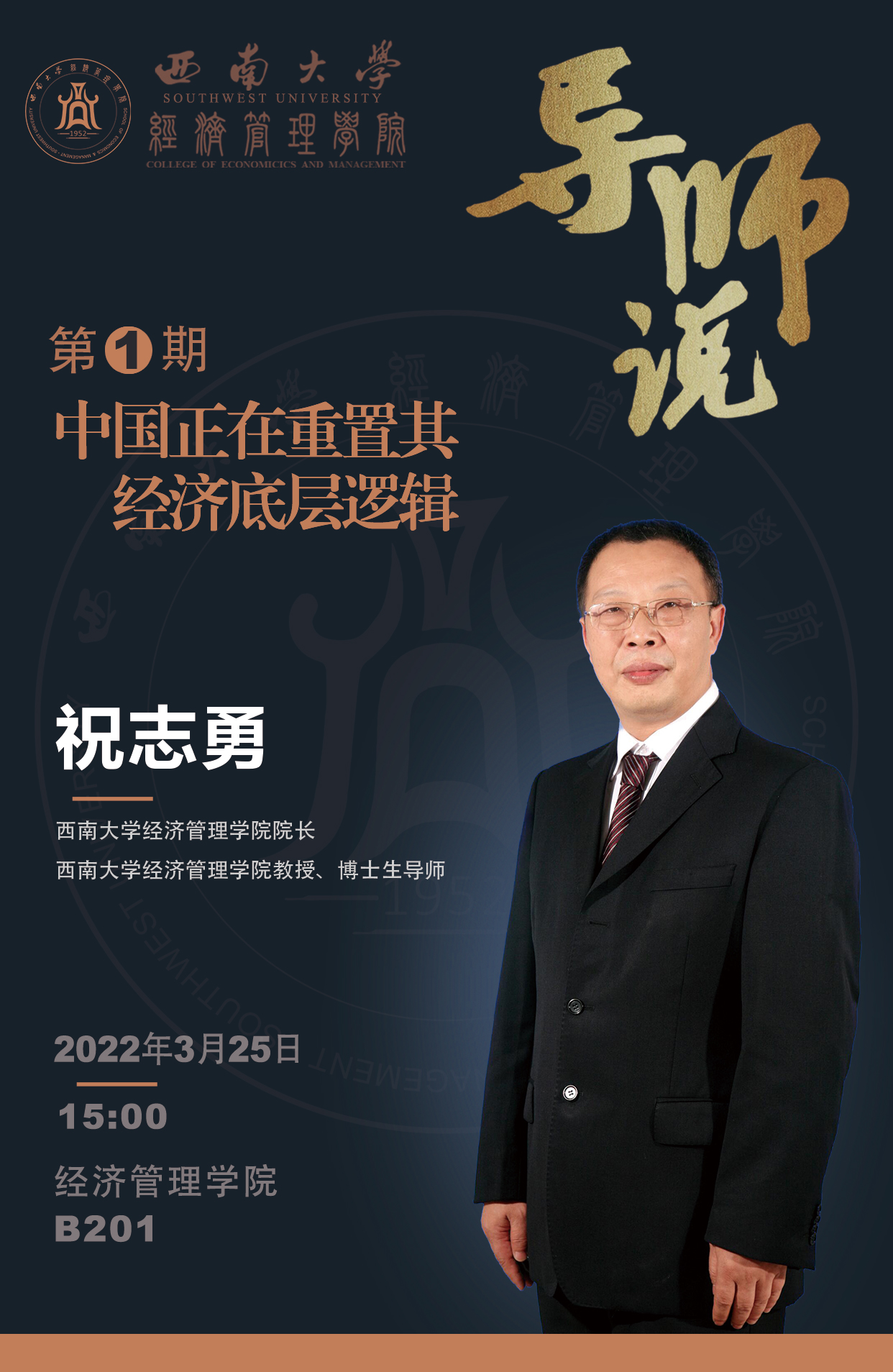 2022年3月25日15:00,“导师说”第1期即将举行。本期的主讲嘉宾为新葡的京集团35222vip经理、博士生导师祝志勇教授,主讲题目为《中国正在重置其经济底层逻辑》,欢迎大家积极报名参与!