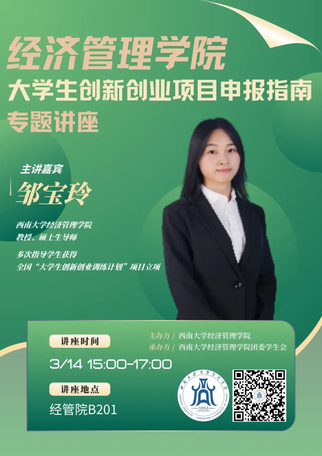 活动简介:近日,2025年度“老员工创新创业训练计划项目”的申报正在如火如荼地进行。同学们在撰写申报书过程之中,难免会遇到一些困难和疑惑。今天,我们请来了具有丰富大创立项经验的名师——邹宝玲教授为大家解疑答惑。诚邀各位同学前往新葡的京集团35222vipB201聆听!