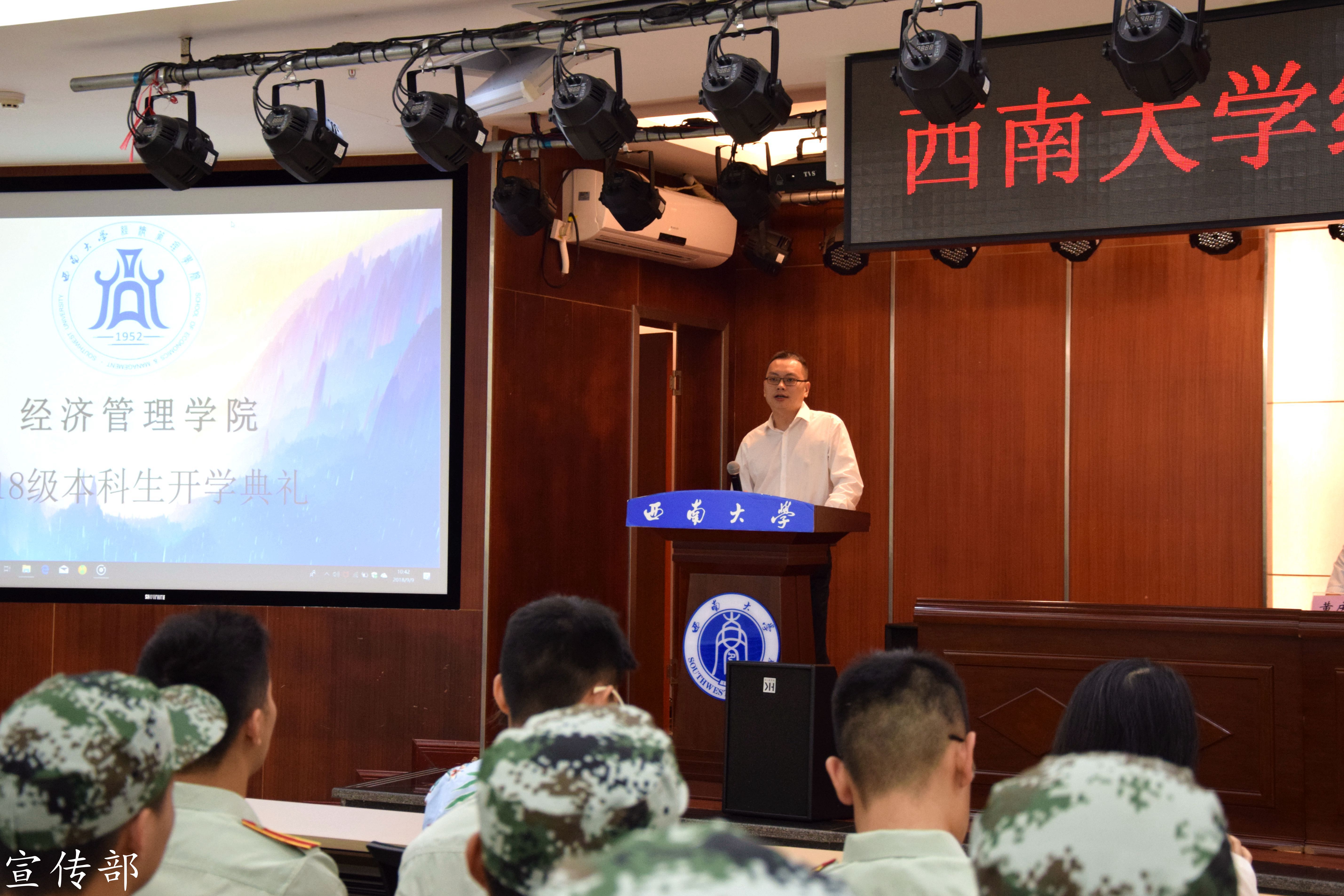 9月9日上午,2018级本科生开学典礼在公司B101报告厅隆重举行。新葡的京集团35222vip经理温涛教授、公司党委副书记、纪委书记张其光老师、公司党委副书记田丽老师、副经理张应良教授、高远东教授、黄庆华副教授,公司教师代表以及2018级全体本科生参加开学典礼。经济管理公司党委书记祝志勇教授主持开学典礼。
