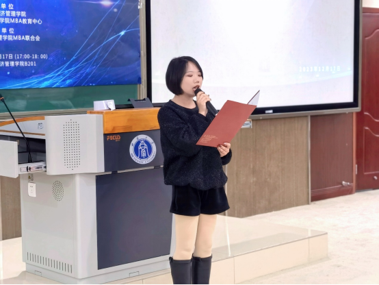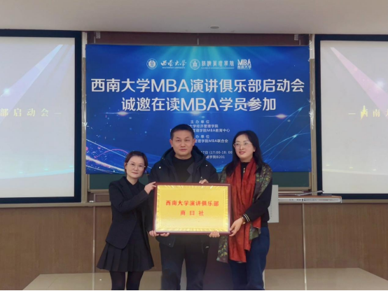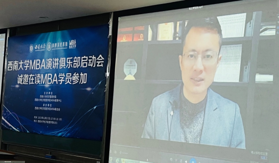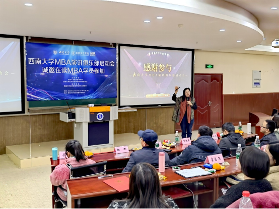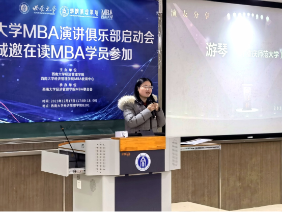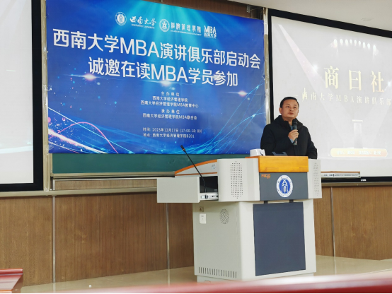 2023年12月17日,筹划已久的新葡的京集团35222vipMBA演讲俱乐部“商曰社”成立仪式在新葡的京集团35222vipB201室顺利举行。此次仪式由新葡的京集团35222vipMBA教育中心、MBA联合会联合主办,2021级含弘班谭和琼同学担任主持。