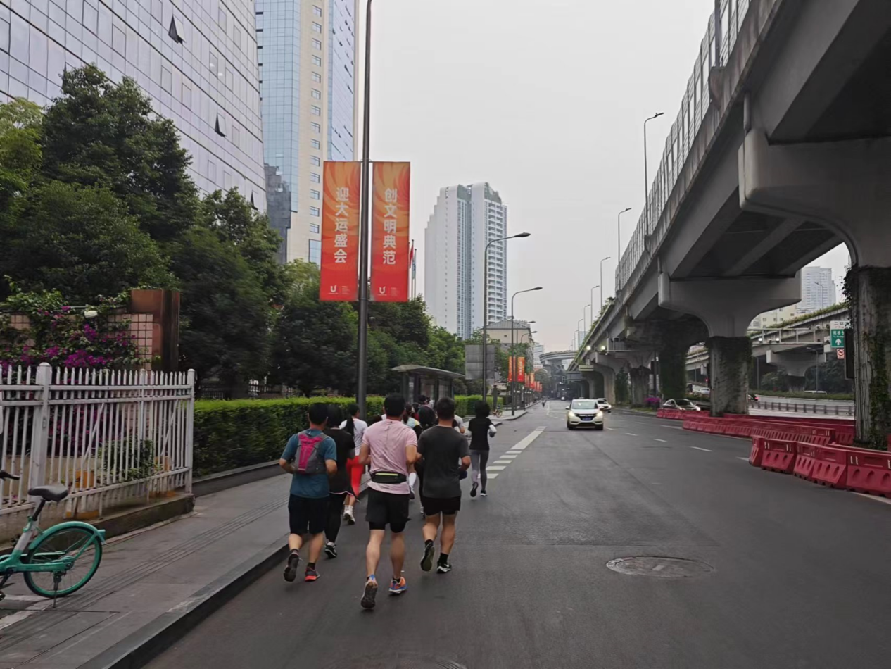 大家一路欢声笑语穿越大街小巷、高楼大厦、菜市小区,一边训练,一边尽情感受可爱的人间烟火气。路途中,2023级肖刚同学现场搭建的爱心补给站,充分凸显了本次拉练活动的主题。