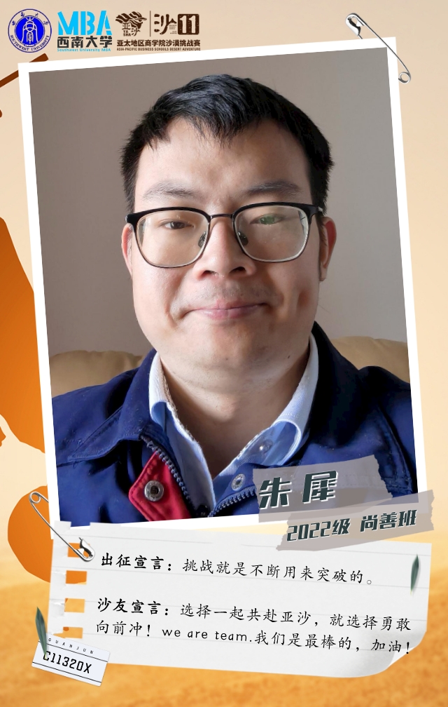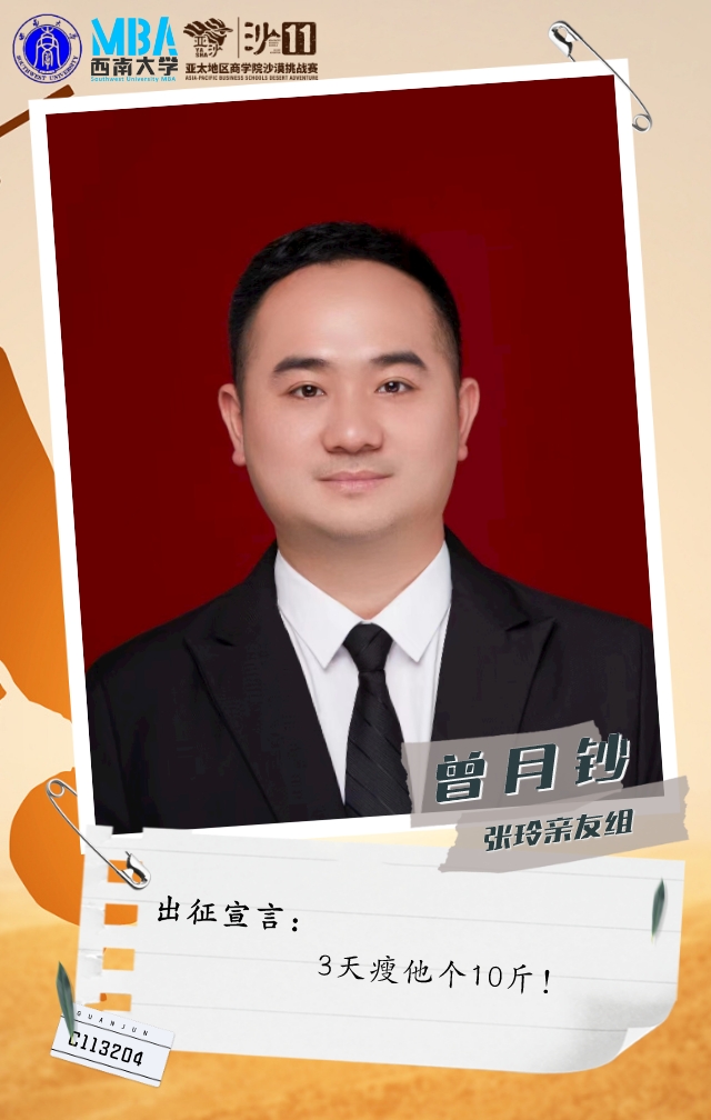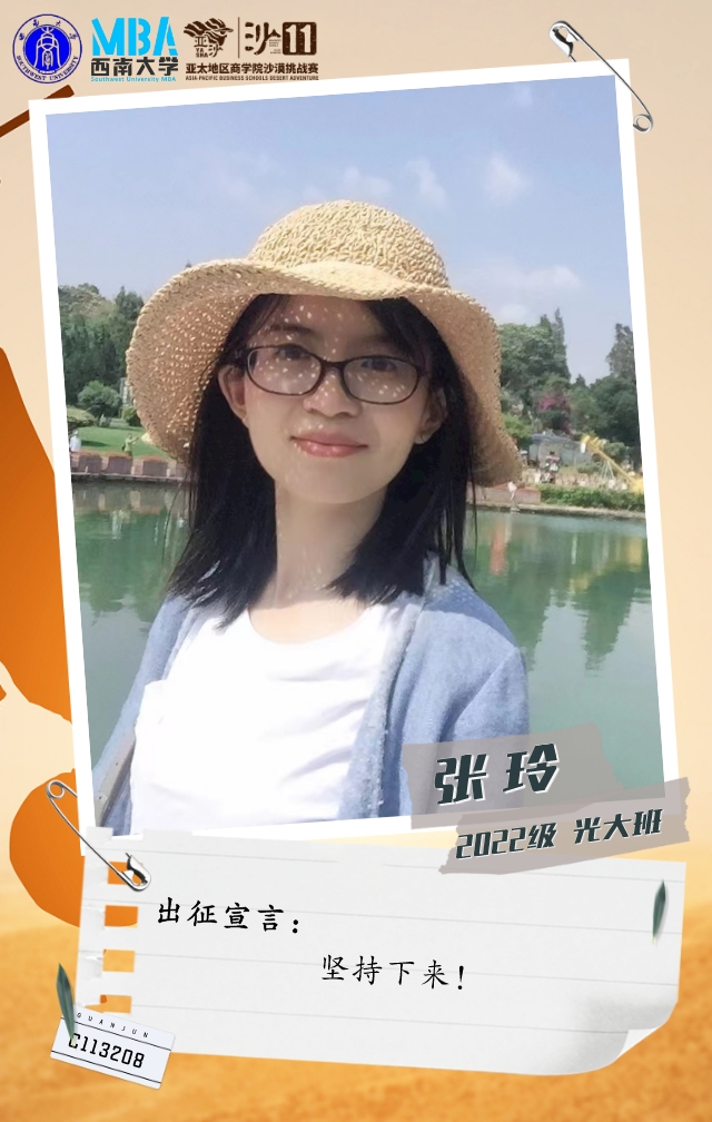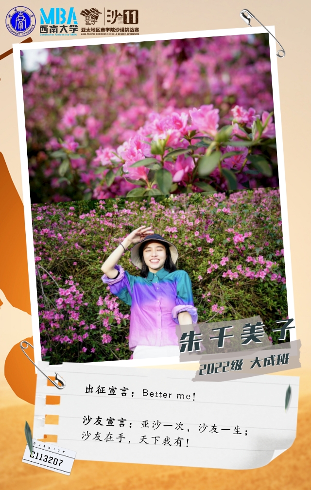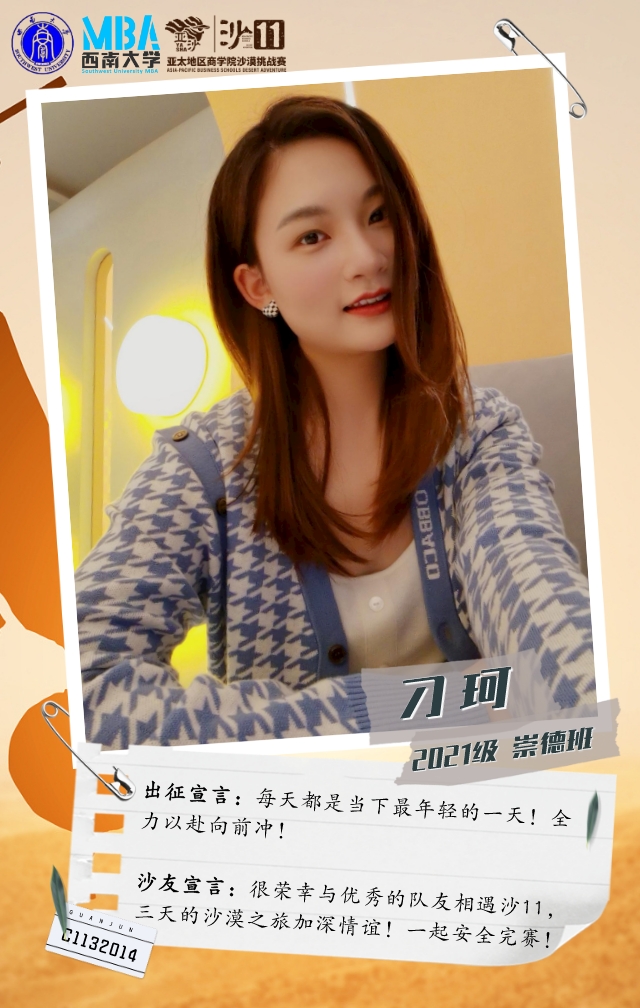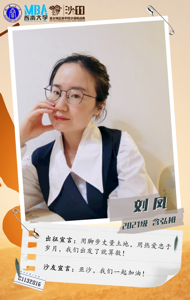 她是一个在MBA开学线下活动中,听“天生i跑俱乐部”发起人刘文宏宣讲亚沙后,被赛事深深吸引而加入俱乐部的温柔女孩。她从不爱跑步到报名挑战沙11,强身健体的同时,只为和沙友一起在沙漠中并肩前行!