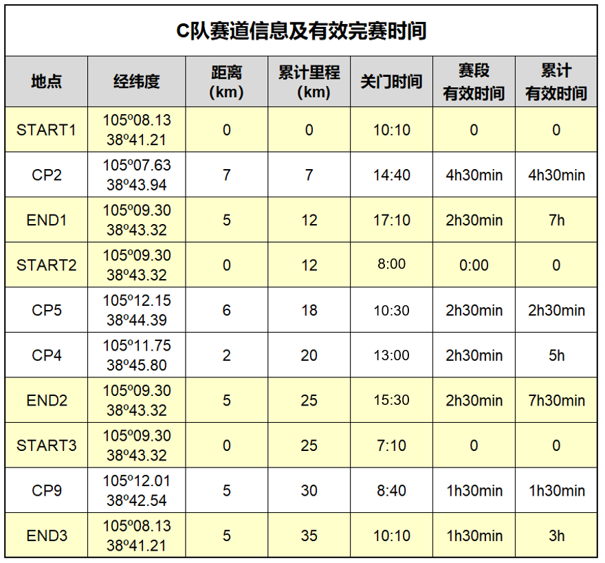 赛道描述:出发后约1km的硬化赛道,穿越沙漠公路进入沙漠。需严格按照引导旗进入沙漠,避免因有公路围栏造成绕道。进入沙漠地形,中小沙丘地形,较为平缓,慢慢适应沙漠徒步。此处需严格按照引导旗行走,禁止进入草滩。经过3km后,开始进入中大沙丘地形,需翻越沙丘,也将见到C队全程最美赛道,看见沙漠之美。强烈建议准备登山杖,帮助翻越大沙丘。