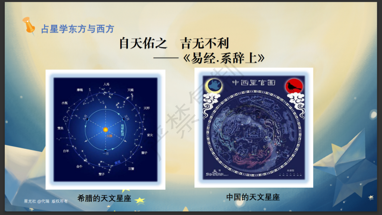 接下来,代老师揭开西方占星学的神秘面纱——纪元前三千多年,美索不达米亚平原的古游牧民族通过对天体的观察发现了太阳、月亮及五大行星的特殊性,结合天体崇拜和原始信仰渐渐发展出占卜形式,从而奠定了今天占星学的基础。
