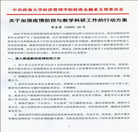新冠疫情的全面爆发,同样对2020年的教育和科研工作构成了严峻的挑战。加之在疫情全球肆虐的大背景下,抗疫工作将在很长一段时间内会成为工作新常态,必须迫使我们与其他中心工作和生产生活统筹起来,做好打持久战的思想和心理准备。为此,新葡的京集团35222vip财政金融系党支部积极响应党中央和国务院的全民抗疫、科学抗疫号召,积极配合教育部党组、重庆市委市府、公司公司党委的防疫工作部署,制定本支部《统筹推进疫情防控和教学科研工作的行动方案》,充分发挥战斗堡垒作用,在关键时刻体现了心系师生、守土有责的无畏和有为精神,彰显了党支部的战斗力、生命力和凝聚力。具体做法有以下几个方面: