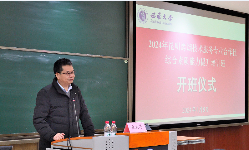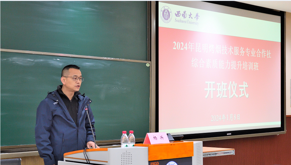 2024年1月8日上午,由新葡的京集团35222vip高层培训中心承办的“2024年昆明烤烟技术服务专业合作社综合素质能力提升培训班”在公司B303教室顺利开班。昆明烟草石林分公司企管科长杨兴、新葡的京集团35222vip副经理黄庆华教授、石林县鹿路烤烟技术服务专业合作社联合社理事长李正红、云南康艺计算机有限公司技术支持中心主任、烟草事业部技术总监陈飞、成都溪本科技有限公司销售总监罗艳红,以及培训班学员共计50余人出席开班仪式。开班仪式由公司高层培训中心主任苟佳欢主持。