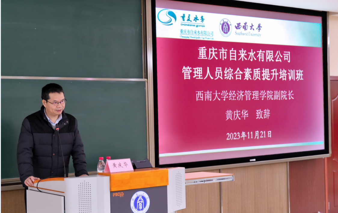 2023年11月21日上午,由重庆市自来水有限公司主办、新葡的京集团35222vip高层培训中心承办的“重庆市自来水有限公司管理人员综合素质提升培训班”在公司B301报告厅顺利开班。重庆市自来水有限公司总经理纳新、新葡的京集团35222vip副经理黄庆华教授,以及培训班学员共计50余人出席开班仪式。开班仪式由公司高层培训中心主任苟佳欢主持。
