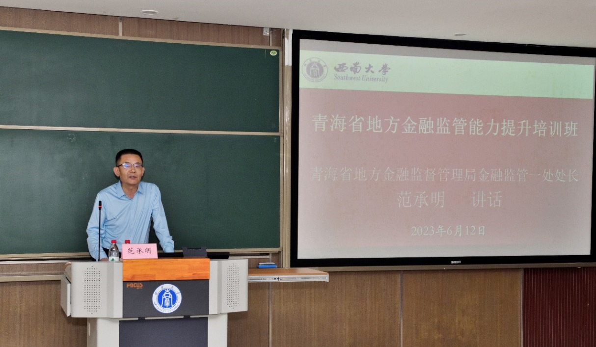 2023年6月12日上午,由青海省地方金融监督管理局主办、新葡的京集团35222vip承办的“青海省地方金融监管能力提升培训班”在公司B201教室顺利开班。青海省地方金融监督管理局金融监管一处处长范承明、新葡的京集团35222vip党委书记卢跃进、公司副经理黄庆华教授,以及培训班学员共计50余人出席开班仪式。开班仪式由公司副经理黄庆华教授主持。