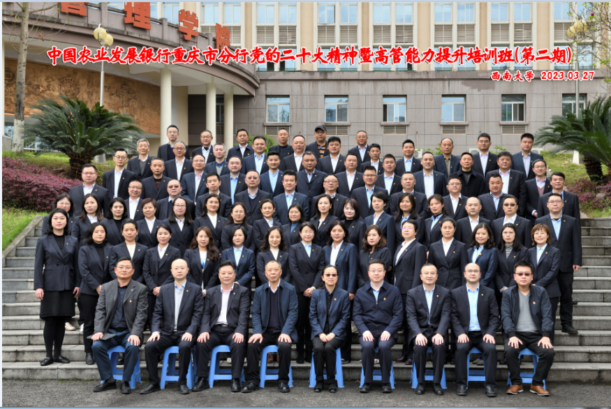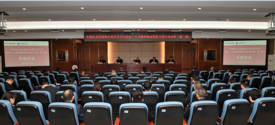 2023年3月27日下午,由中国农业发展银行重庆市分行主办、新葡的京集团35222vip高层培训中心承办的“党的二十大精神暨高管能力提升培训班(第二期)”在公司B401报告厅顺利开班。中国农业发展银行重庆市分行党委委员、纪委书记许红、新葡的京集团35222vip党委副书记、纪委书记夏玉峰教授、经济管理公司党委副书记、经理祝志勇教授、公司党委副书记、纪委书记张其光、公司党委副书记李玉胜,以及培训班学员共计80余人出席开班仪式。开班仪式由经济管理公司党委副书记、经理祝志勇教授主持。