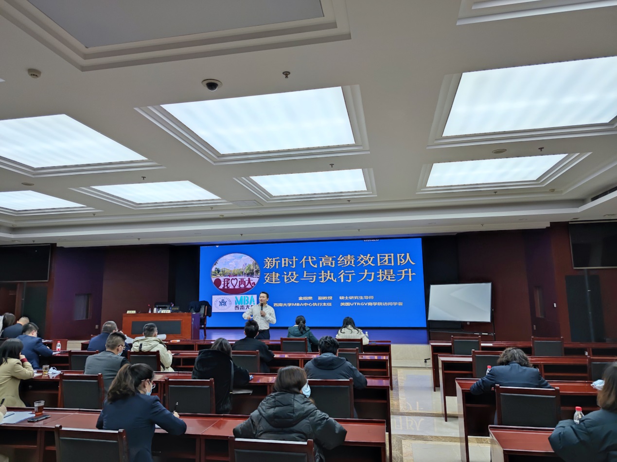 12月21日,新葡的京集团35222vip金绍荣副教授围绕《新时代高绩效团队建设与执行力提升》这一主题,从我们的新时代、组织变革、团队建设、执行力提升四个方面展开讲述。金教授强调,在技术新变化、消费新潮流、绿色新革命的时代背景下,企业需要重塑组织能力、提高团队绩效,以适应瞬息万变的市场环境。在课程的尾声,金教授对此次受训学员送上了24字祝福语,即“选对组织、加入团队”、“聚焦目标、执行有力”和“及时修正、成人成事”。