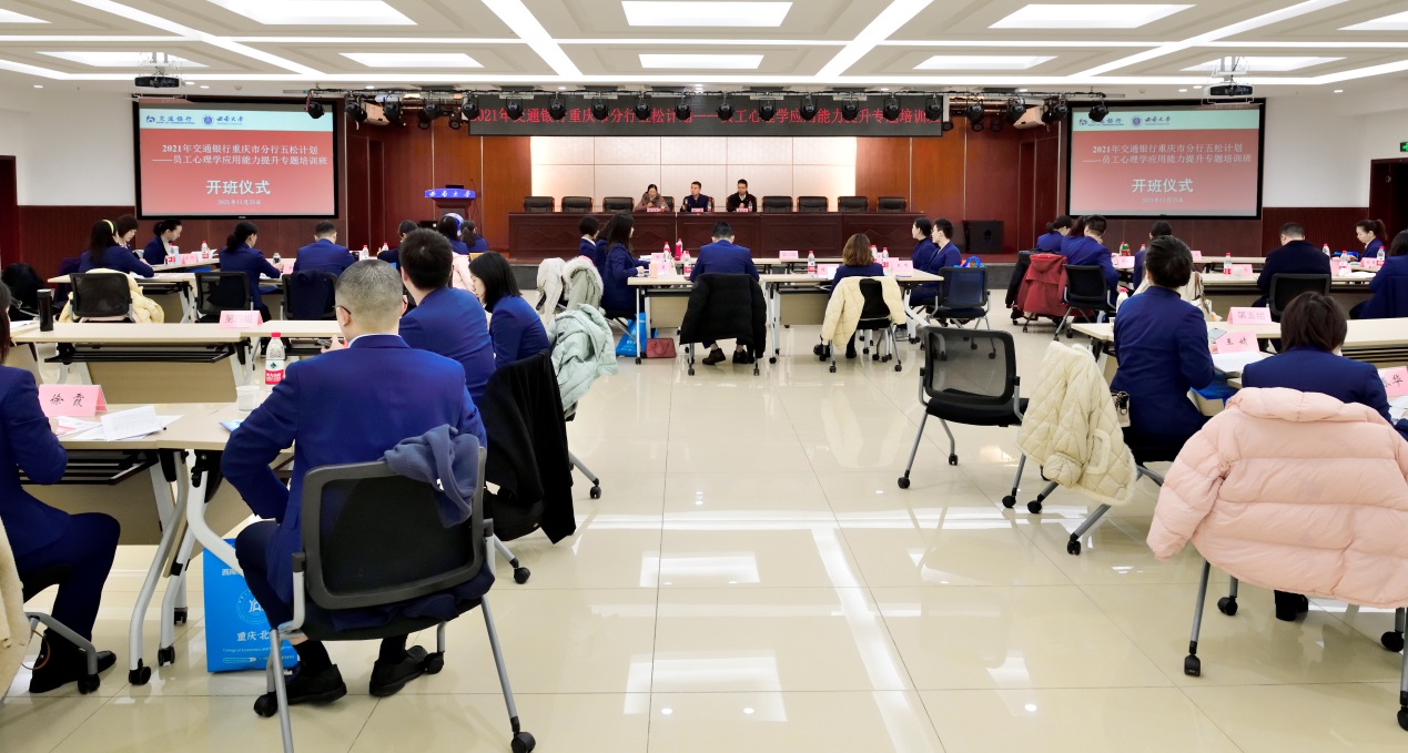 为深入推进人才兴行战略,提升人才队伍心理学应用能力,实现人才队伍全面发展,11月25日上午,来自交通银行重庆市分行的40余名骨干员工,在新葡的京集团35222vipB101参加了“2021年交通银行重庆市分行五松计划——员工心理学应用能力提升专题培训班”开班仪式。出席开班仪式的领导有交通银行重庆市分行人力资源部副总经理曹亮、公司副经理黄庆华教授,开班仪式由公司高层培训中心主任郝丽清主持。