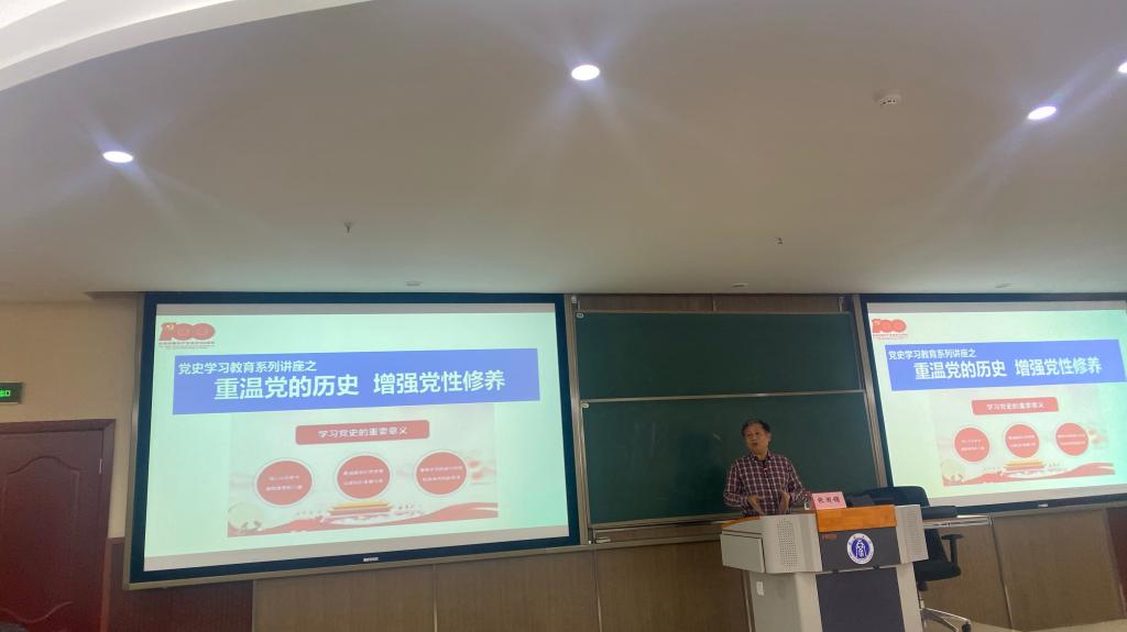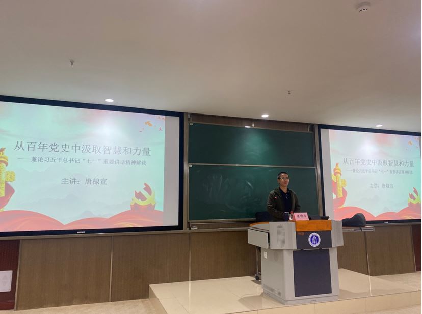上午,唐棣宣副教授围绕《从百年党史中汲取智慧和力量——兼论习近平总书记“七一”重要讲话精神解读》这一主题,从“新民主主义革命时期(1921-1949)”、“社会主义革命和建设时期(1949-1978)”、“改革开放和社会主义现代化建设时期(1978-2012)”、“中国特色社会主义新时代(2012-至今)”四个方面展开讲述。中国共产党的百年历史告诫我们要坚持中国共产党的领导,以史为鉴,开创未来,实现中华民族的伟大复兴。