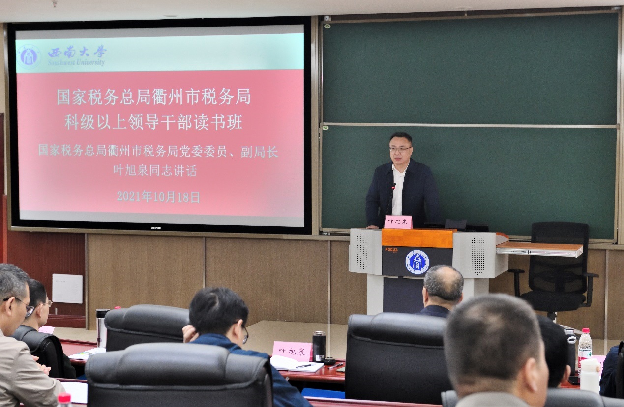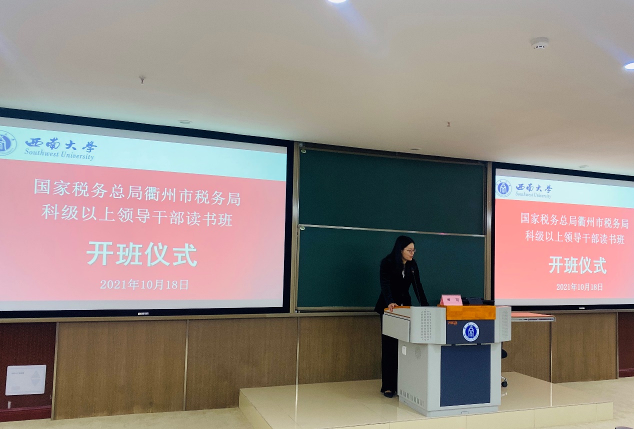 2021年10月18日上午,由国家税务总局衢州市税务局主办,公司承办的国家税务总局衢州市税务局科级以上领导干部读书班顺利开班。衢州市税务局党委委员、副局长叶旭泉,衢州市税务局党委委员、副局长谢钦,衢州市税务局党委委员、总经济师傅红雨,公司经理祝志勇教授,公司党委副书记田丽以及培训学员共50余人出席开班仪式。开班仪式由公司党委副书记田丽主持。
