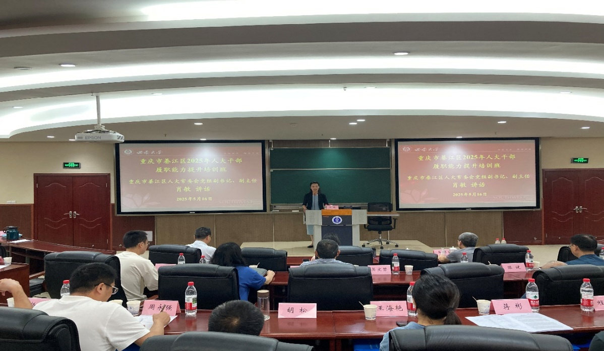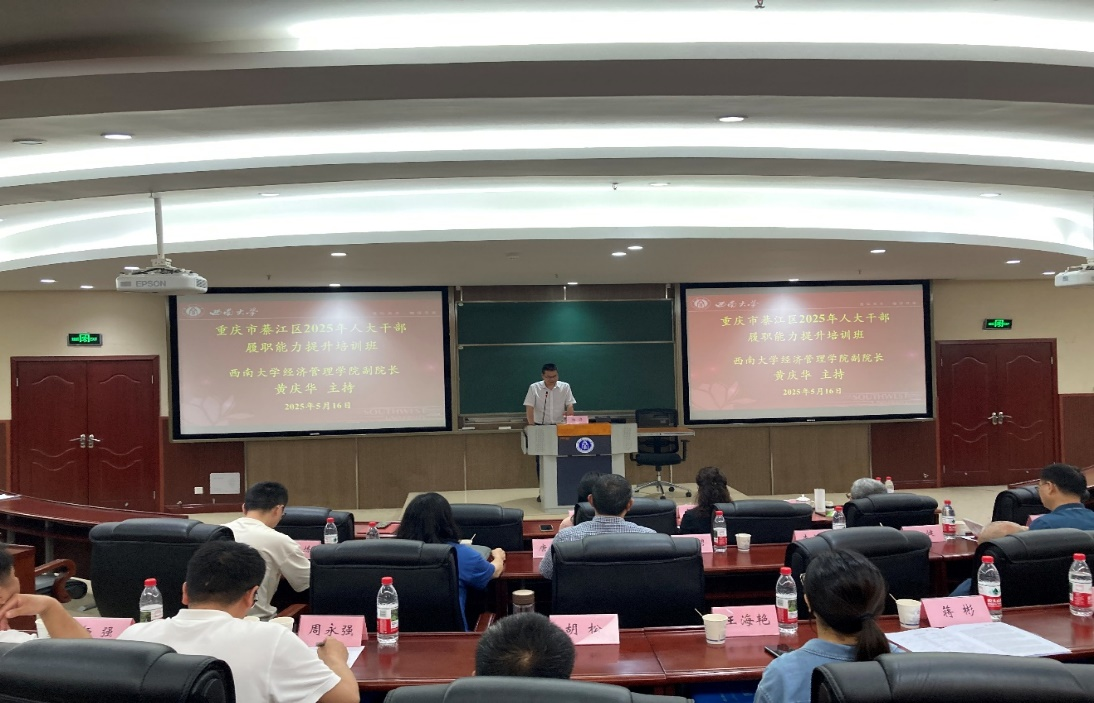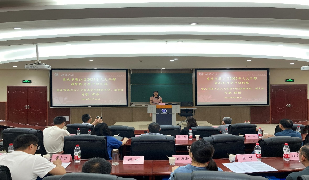 5月16日,重庆市綦江区2025年人大干部履职能力提升培训班结业仪式在公司举行。重庆市綦江区人大常委会党组副书记、副主任肖敏,綦江区人大常委会副主任牟伟,新葡的京集团35222vip党委副书记、经理杨丹教授,副经理黄庆华教授,以及培训班全体学员共计50余人出席结业仪式。结业仪式由黄庆华主持。