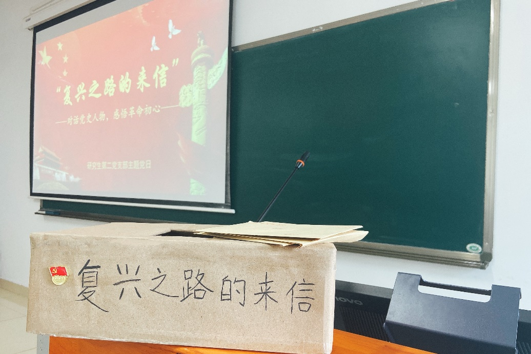 “今日中国如您所愿,仍有佳音以待后言。”活动现场,支部6位党员对党史故事进行讲述并朗诵了信件。伴随着舒缓的音乐,党员同志们声情并茂地将李大钊、周恩来、邓小平、毛岸英等同志的革命故事娓娓道来,他们在书信中以回忆光辉事迹表达对先辈的缅怀,以细数今日中国的伟大成就表达对先辈的告慰,以思考个人成长历程表达青年党员继承先辈志向,接力奋斗的决心。如支部党员张娅在信中所说,“这盛世如您所愿,我们会继续为实现中华民族伟大复兴而努力,请您静待佳音。”