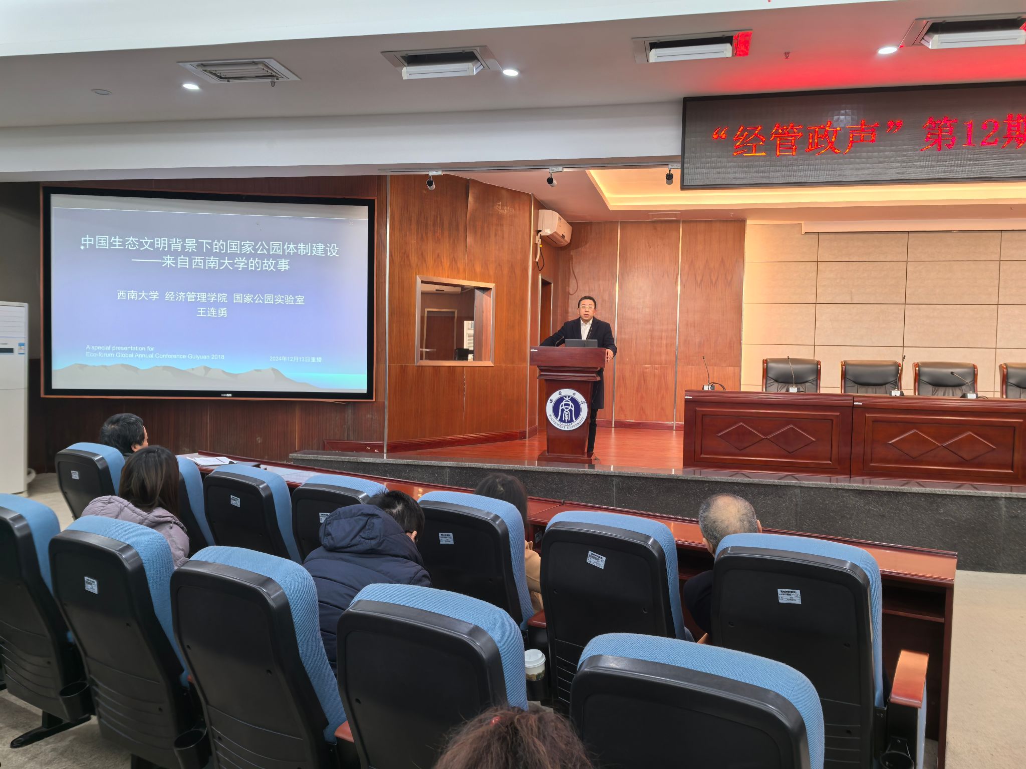 12月13日下午,公司“经管政声”第12期在B401报告厅顺利举行。公司王连勇教授以《中国生态文明背景下的国家公园体制建设——来自新葡的京集团35222vip的故事》为题,为全体教职工作报告。本次活动由公司党委书记卢跃进主持。