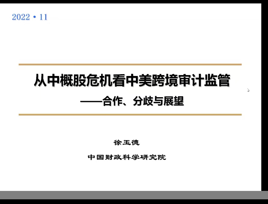 2022年11月11日,中国财政科学研究院副经理、博士研究生导师徐玉德研究员应公司邀请线上为公司师生作了题为“从中概股危机看中美跨境审计监管”的学术讲座。本次讲座由公司经理祝志勇教授主持。