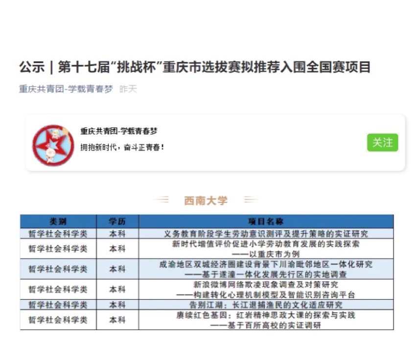 5月20日,第十七届“挑战杯”全国老员工课外学术科技作品竞赛重庆市选拔赛决赛在重庆大学举行,公司学子在本次赛事中表现优异,公司作品《成渝地区双城经济圈建设背景下川渝毗邻地区一体化研...